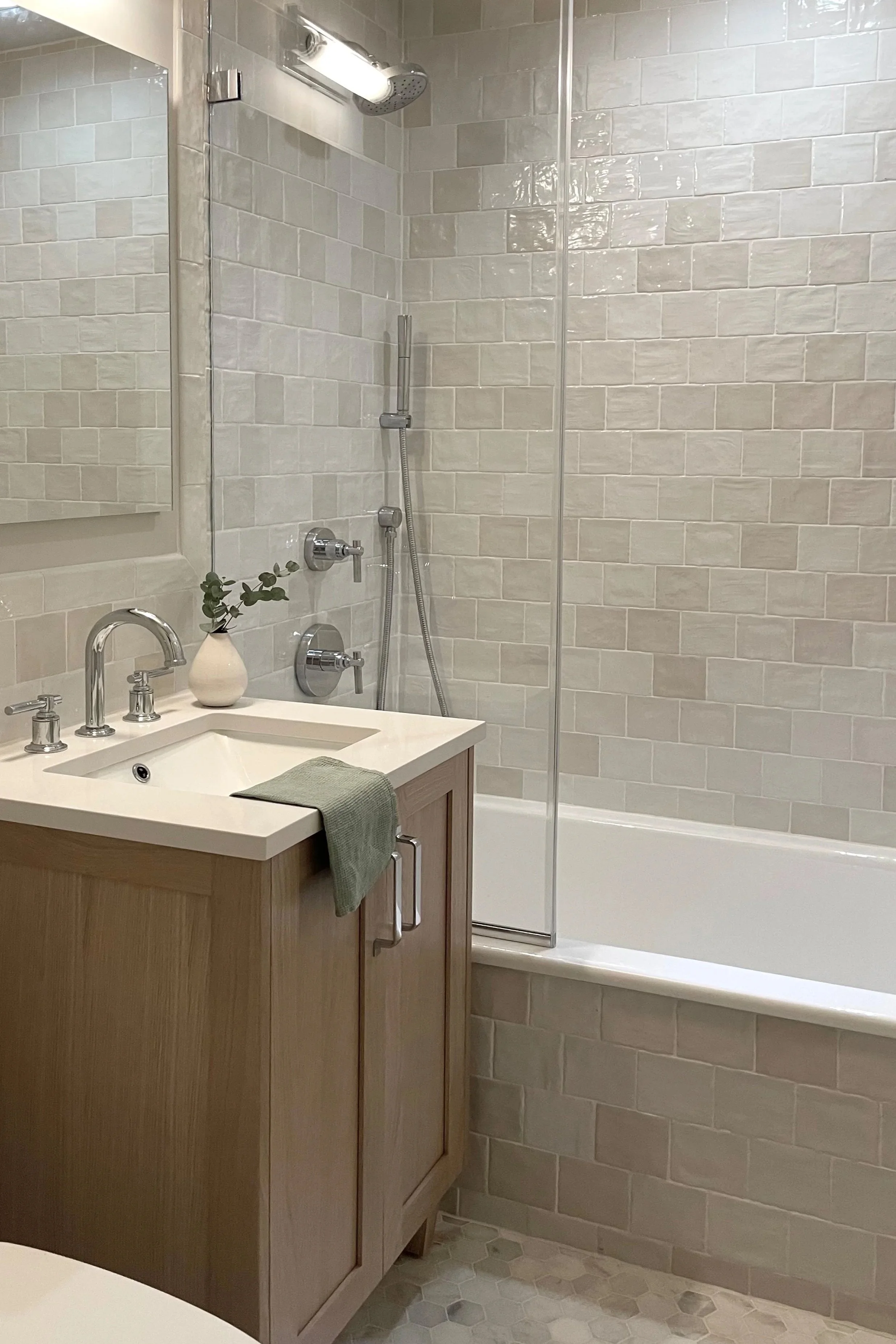 This renovation focused on rethinking the layout and adding warmth and character. The living room, kitchen, and hall originally flowed into one another as a single open area, which felt undefined. By introducing subtle partition walls and framing the transitions between spaces, we created clearer zones and a greater sense of intimacy. Crown molding and tailored trim details add elegance and charm throughout. Soft, muted paint tones bring a serene, timeless atmosphere. The bathroom was fully redesigned to align with the overall vision and enhance the gentle, calming feel. Natural textures and layered décor complete the look, punctuated by a bold pop of color.